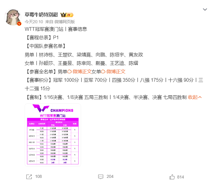 9月9日-9月14日澳门冠军赛将决出男单、女单的冠军,这一站冠军积分是1000分。