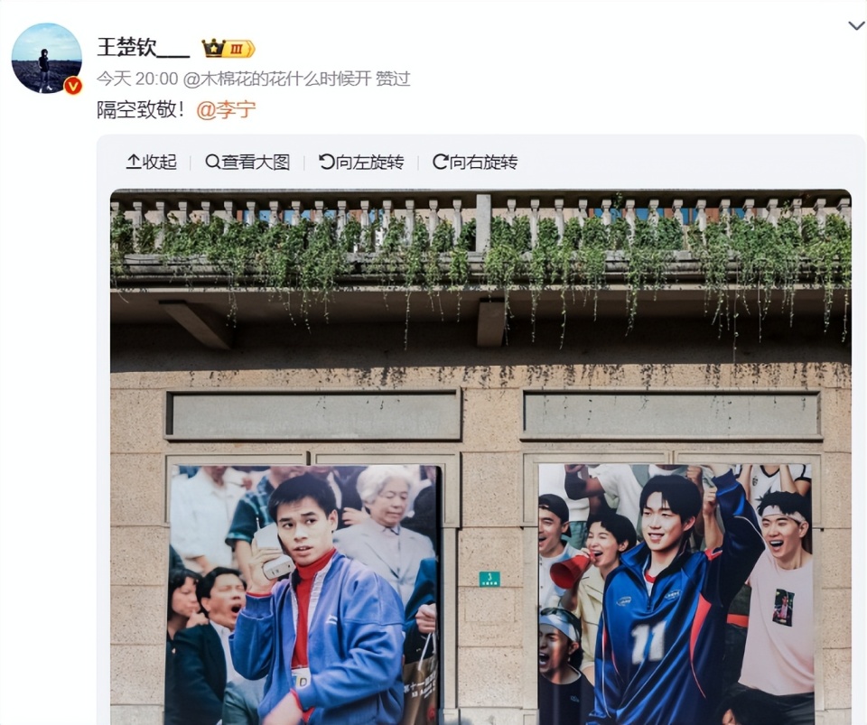 王楚钦本人也晒出两人的海报写道:隔空致敬@李宁。